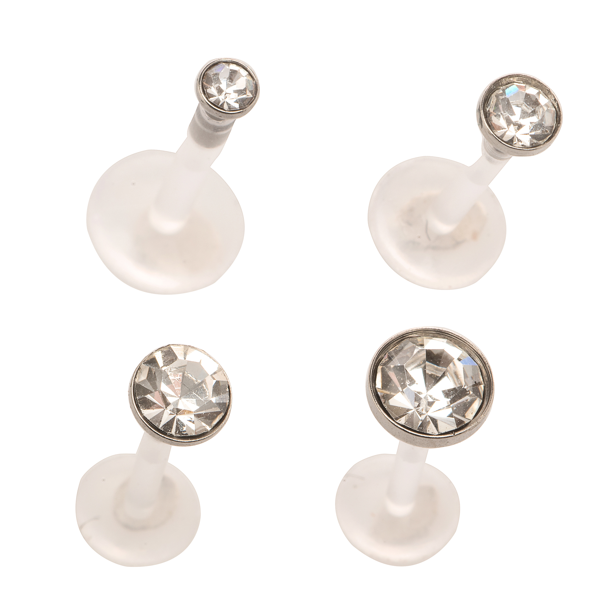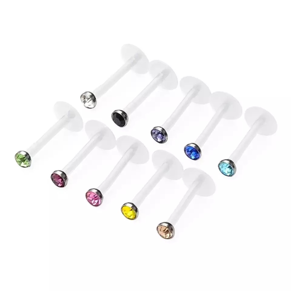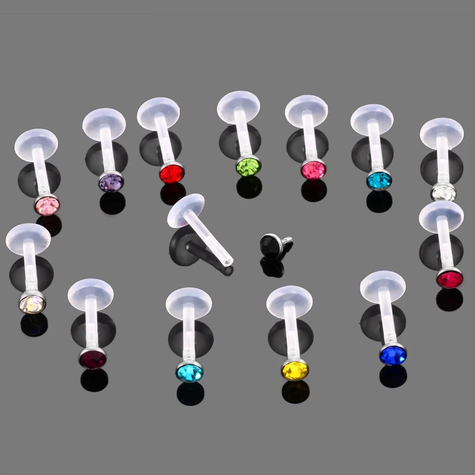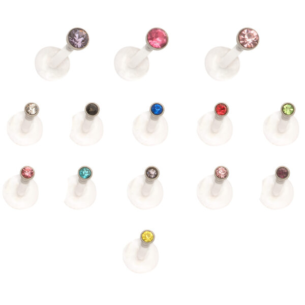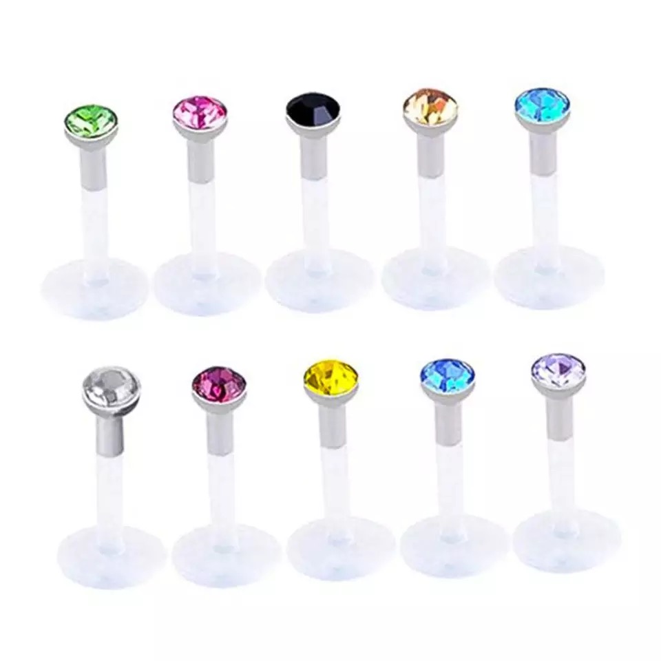 Κλασσικό labret σκουλαρίκι το οποίο μπορεί να φορεθεί σε όλα τα piercings του αυτιού αλλά και στα χείλη. Το σκουλαρίκι είναι καρφωτό από ακρυλικό υλικό όπου την άκρη του καταλήγει ένα μικρό διαμάντι. Αυτό σημαίνει ότι η τάπα του κοσμήματος δεν ερεθίζει την πίσω πλευρά της τρύπας. Είναι κατάλληλο για εύκολες αλλαγές του κοσμήματος αλλά και ενδείκνυται για δυναμικά σπορ, αφού το συγκεκριμένο κόσμημα δεν τραυματίζει το σημείο που το φοράμε καθότι είναι ακρυλικό.Διατίθεται σε διάφορα χρώματα και μεγέθη διαμαντιών αλλά και μήκη.